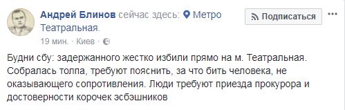 "Задержанного жестко избили прямо на м. Театральная. Собралась толпа, требуют пояснить, за что бить человека, не оказывающего сопротивления. Люди требуют приезда прокурора и достоверности корочек эсбэшников", - сообщил он.