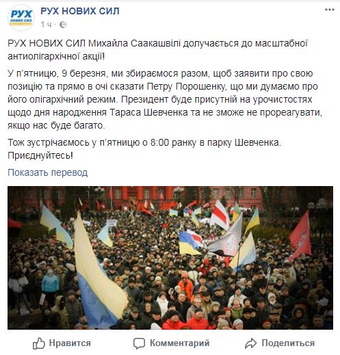 "В пятницу, 9 марта, мы собираемся вместе, чтобы заявить о своей позиции и прямо в глаза сказать Петру Порошенко, что мы думаем о его олигархическом режиме. Президент будет присутствовать на торжествах по случаю дня рождения Тараса Шевченко и не сможет не отреагировать, если нас будет много", – сказано в сообщении.