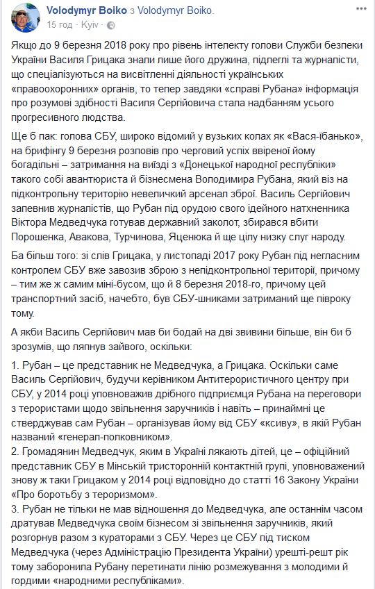 "Если до 9 марта 2018 об уровне интеллекта председателя Службы безопасности Украины Василия Грицака знали только его жена, подчиненные и журналисты, специализирующиеся на освещении деятельности украинских "правоохранительных" органов, то теперь благодаря "делу Рубана" информация об умственных способностях Василия Сергеевича стала достоянием всего прогрессивного человечества.