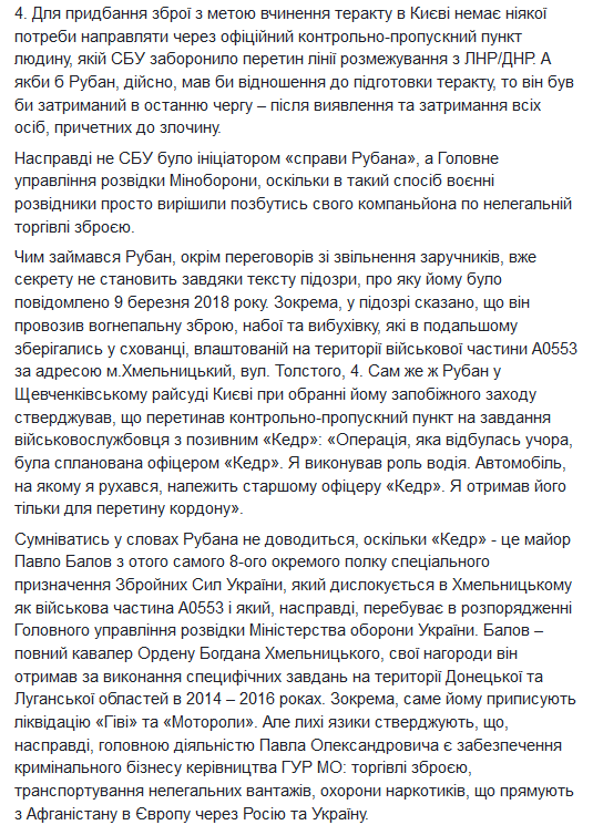 По его мнению, "Рубан действительно участвовал в совместных с СБУ схемах торговли оружием. То, что потяжелее, минометы и мины, уходило за границу. Естественно, оружие возили не из оккупированных территорий (это глупо), а с нашего бока линии фронта. Годами сотрудничали и все было нормально.
