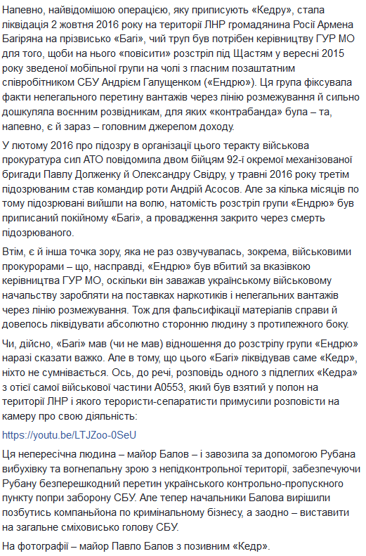 Наверное, самой известной операцией, которую приписывают "Кедру", стала ликвидация 2 октября 2016 на территории ЛНР гражданина России Армена Багирян по прозвищу "Баги", чей труп был нужен руководству ГУР МО для того, чтобы на него "повесить" расстрел под Счастьем в сентябре 2015 сводной мобильной группы во главе с гласным внештатным сотрудником СБУ Андреем ГАЛУЩЕНКО ( "Эндрю"). Эта группа фиксировала факты нелегального пересечения грузов через линию разграничения и сильно донимала военных разведчиков для которых "контрабанда" была - и, наверное, есть и сейчас - главным источником дохода.