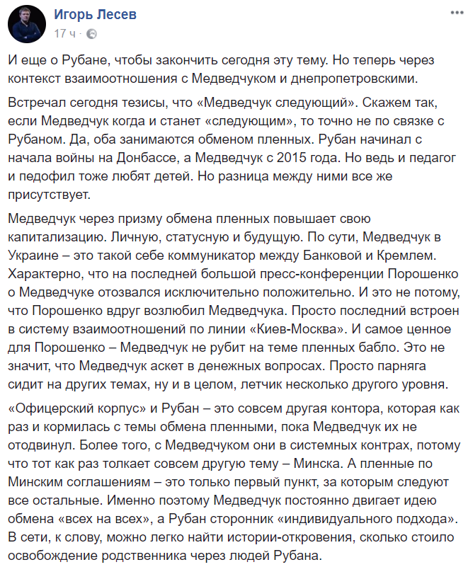 "... Хочу сказать про Рубана и Медведчука, о чем сразу все сейчас заговорили. Не знаю, что их связывало в 2013-2014-е, но в последние годы отношения между ними были тяжелыми, так как конкурировали они на одной теме – обмене пленных. Ну как конкурировали. С 2015 года этот процесс курирует Виктор Медведчук и Рубана полностью из него исключили. По этой причине Рубан неоднократно публично критиковал Медведчука. Попытка Рубана вместе с Савченко вклиниться в процесс в конце 2016 года, напрямую связавшись с сепаратистами, закончилась тем, что СБУ сначала задержала Рубана, а затем запретила ему въезд на неподконтрольные территории.