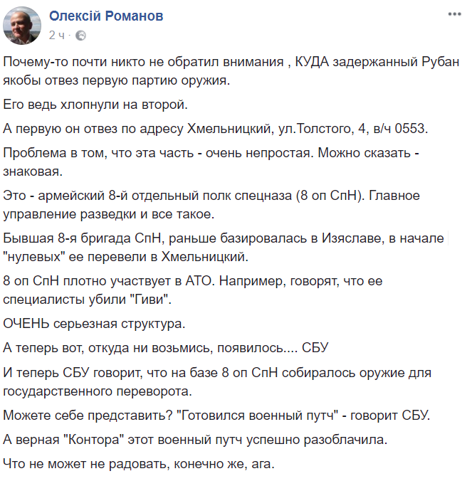 Еще на одно "белое пятно" указывает журналист Алексей Романов. Он говорит, что за попыткой сделать из Рубана "террориста №1" никто не заметил настоящий военный путч, наличие которого следует хотя бы из текста "пидозры" переговорщику.
