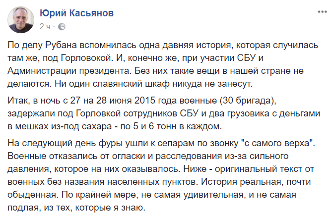 "По делу Рубана вспомнилась одна давняя история, которая случилась там же, под Горловкой. И, конечно же, при участии СБУ и Администрации президента. Без них такие вещи в нашей стране не делаются. Ни один славянский шкаф никуда не занесут.