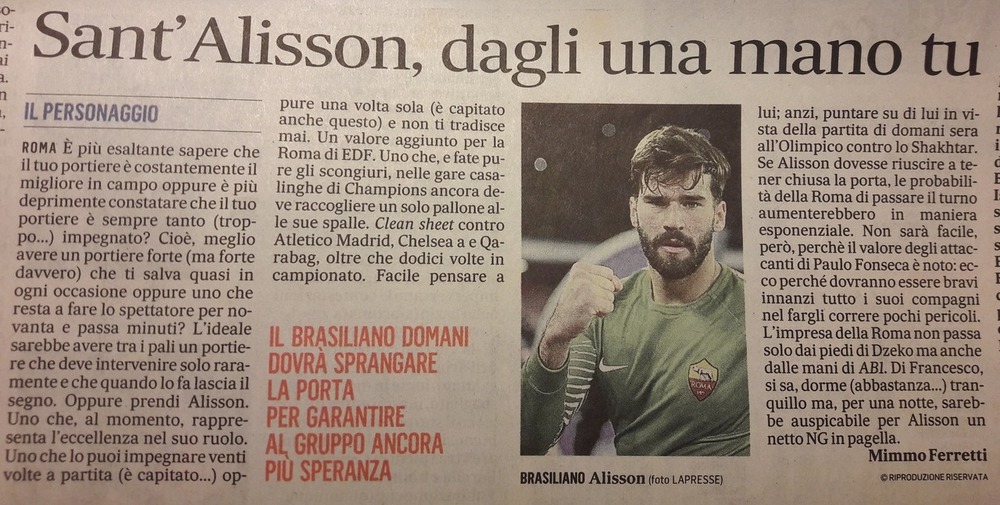 Кипера Ромы Алиссона журналисты назвали - святым, фото: Messaggero