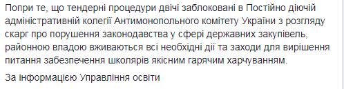В РГА пишут, что "предвидя заранее то, что договоры о предоставлении услуг по организации горячего питания заканчиваются торги на закупку указанных услуг было объявлено 13 декабря 2017 года". "Срок раскрытия предложений 12 января 2018 года. Указанные торги были отменены 26 января 2018 года через обжалование процедуры в Постоянно действующей административной коллегии Антимонопольного комитета Украины по рассмотрению жалоб о нарушении законодательства в сфере государственных закупок. 10 января 2018 года для обеспечения учреждений образования услугами по организации горячего питания во время обжалования процедуры были объявлены вторые торги. Раскрытие предложений состоялось 14 февраля 2018 года", - говорится в сообщении.