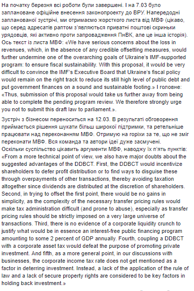 "Представление этого предложения (замена налога на прибыль налогом на выведен капитал) отведет нас дальше того, чтобы иметь возможность завершить действующую программу сотрудничества. Поэтому мы настоятельно призываем Вас не подавать этот законопроект в парламент", - заявили в МВФ.