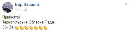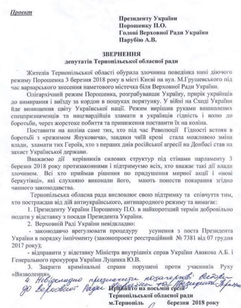 Вчера, 13 марта, Тернопольский облсовет принял обращение об отставке президента после разгона МихоМайдана с подачи ветеранов АТО.