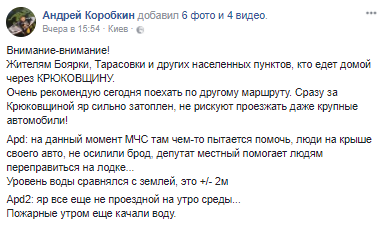 "Внимание-внимание! Жителям Боярки, Тарасовки и других населенных пунктов, кто едет домой через Крюковщину. Очень рекомендую сегодня поехать по другому маршруту. Сразу за Крюковщиной яр сильно затоплен, не рискуют проезжать даже крупные автомобили! МЧС там чем-то пытается помочь, люди на крыше своего авто не осилили брод, депутат местный помогает людям переправиться на лодке... Уровень воды сравнялся с землей, это +/- 2м", – пишет в Facebook Андрей Коробкин.