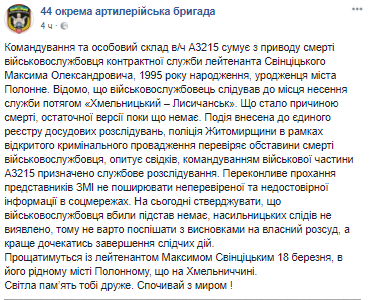 "Командование и личный состав в/ч А3215 скорбит по поводу несчастного случая, который повлек смерть военнослужащего контрактной службы лейтенанта Свинцицкого Максима Александровича, 1995 года рождения, уроженца города Полонное", - сказано в сообщении.