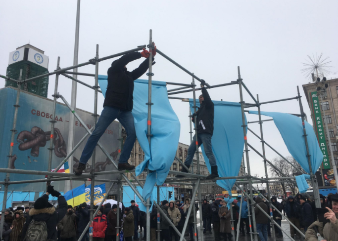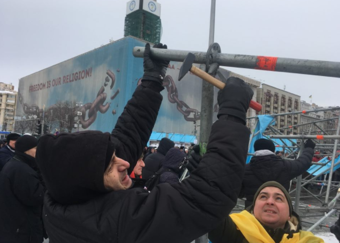 Во время марша активисты РНС разбирали "елку" - металлоконструкции, установленные здесь ранее. Конструкции на Майдане почти доломали.