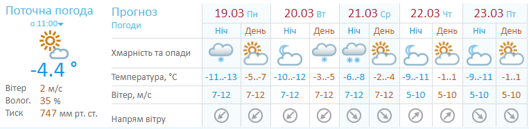 Сайт Укргидрометцентра прогнозирует снег, который начнется днем 20 марта и будет идти до утра 21-го. Ночью обещают -9....-13, днем -2...-7. С понедельника мороз начнет уменьшаться и уже в четверг ожидается -1...+1.