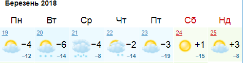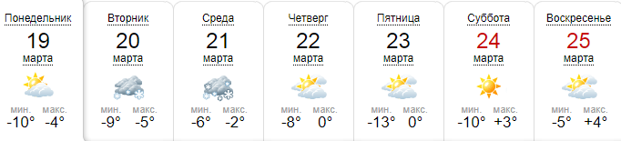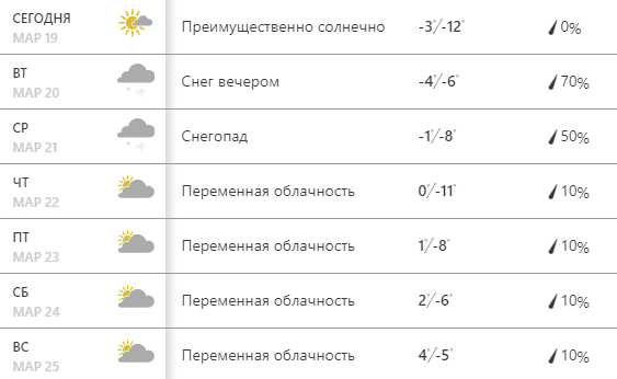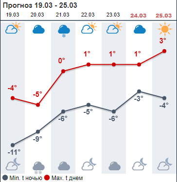 Сайт Weather.com сообщает, что до среды днем будет держаться минусовая температура -1...-3. С четверга днем ожидается плюсовая температура +1...+4. Снег возможен 20 и 21 марта.