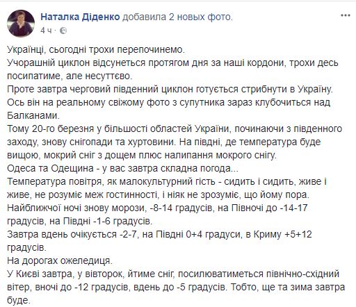 В этот день снова пойдет снег. Синоптик Наталья Диденко в своем Facebook пишет: "Завтра очередной циклон с Балкан принесет в Украину снегопады, ветер, а мороз - удержится. На юге - мокрый снег и дождь, на юго-востоке днем - до "плюсов". В Киеве завтра - снег и мороз".