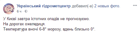 "В Киеве завтра осадков не прогнозируем. На дорогах гололедица. Температура ночью 6-8 ° мороза, днем около 0,"- также прогнозируют синоптики.