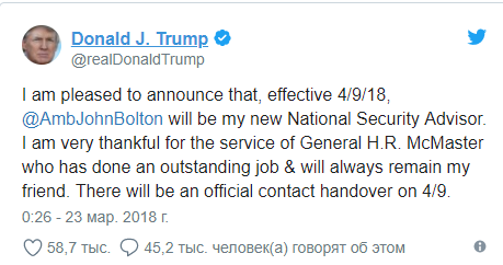 Президент США заменил советника по национальной безопасности. С 9 апреля место Герберта Макмастера, который покидает свой пост, займет бывший представитель США в ООН Джон Болтон.