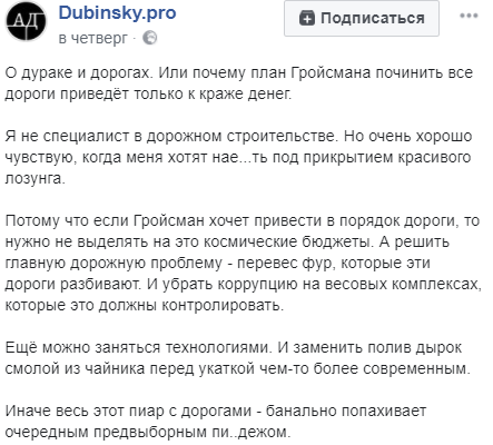 Иначе весь этот пиар с дорогами банально попахивает очередным предвыборным пи..дежом", – написал Дубинский в Facebook.