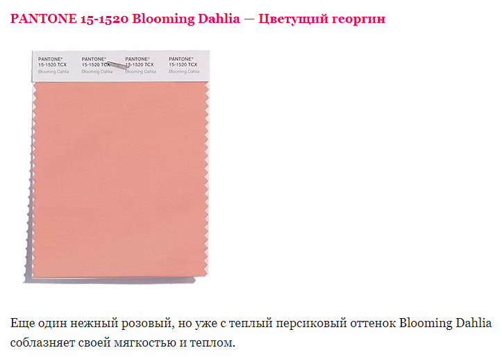 Цвет костюма Мелании Трамп - нежно розовый Pantone 15 1520 - цвет, с теплым персиковым оттенком Blooming Dahlia ("Цветущий георгин"), который соблазняет своей мягкостью и теплом, заявленный в Милане главным цветом 2018 года