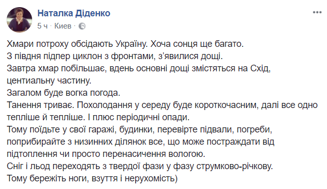 "Облака понемногу осаждают Украины. Хотя солнца еще много. С юга подошел циклон с фронтами, появились дожди. Завтра облаков станет больше, днем основные дожди сместятся на восток, центральную часть. В целом будет сырая погода. Таяние продолжается. Похолодание в среду будет кратковременным, дальше все равно теплее и теплее. И плюс периодические осадки", пишет Диденко.