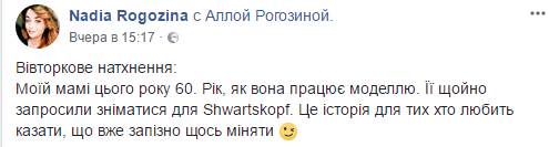 "Моей маме в этом году 60. Год, как она работает моделью. Ее только пригласили сниматься для Shwartskopf. Это история для тех, кто любит говорить, что уже поздно что-то менять", - написала Надежда Рогозина.