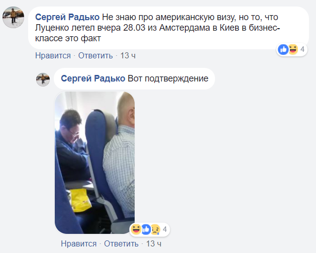 Однако позже появилось подтверждение того, что Юрий Луценко 28 марта действительно был в Амстердаме. Его фото в самолете рейса Амстердам-Киев опубликовал в Facebook пользователь Сергей Радько.