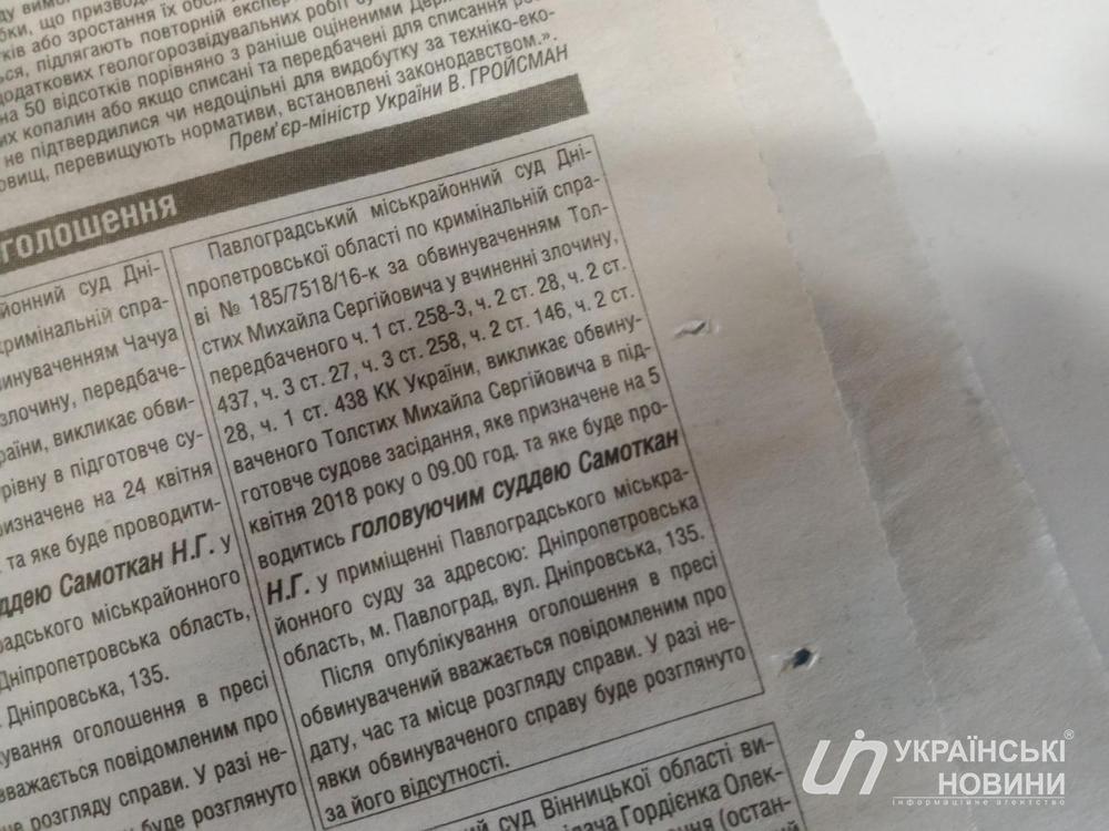 "Павлоградский горрайонный суд Днепропетровской области... вызывает обвиняемого Толстых Михаила Сергеевича в подготовительное судебное заседание, которое назначено на 5 апреля 2018 года на 9:00", - говорится в повестке.