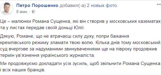 "Это – рисунки Романа Сущенко, которые он создал в московских казематах и в письмах передал своей дочери Юлии", - написал он.