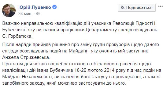 "В течение дня жду от нее окончательного объективного решения относительно квалификации действий Ивана Бубенчика 18-20 февраля 2014 года во время событий на Майдане Независимости, определение его статуса в производстве, а также меры пресечения, который возможно применить к нему", - подытожил Луценко.