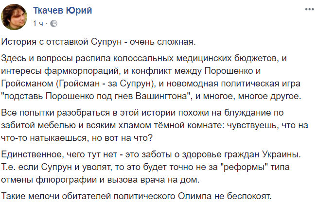 "История с отставкой Супрун - очень сложная, - пишет журналист Юрий Ткачев. - Здесь и вопросы распила колоссальных медицинских бюджетов, и интересы фармкорпораций, и конфликт между Порошенко и Гройсманом (Гройсман - за Супрун), и новомодная политическая игра "подставь Порошенко под гнев Вашингтона", и многое, многое другое.