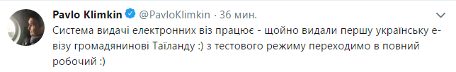 "Система выдачи электронных виз работает - только что выдали первую украинскую е-визу гражданину Таиланда. Из тестового режима переходим в полный рабочий", - написал Климкин в своем микроблоге в соцсети Twitter в четверг.