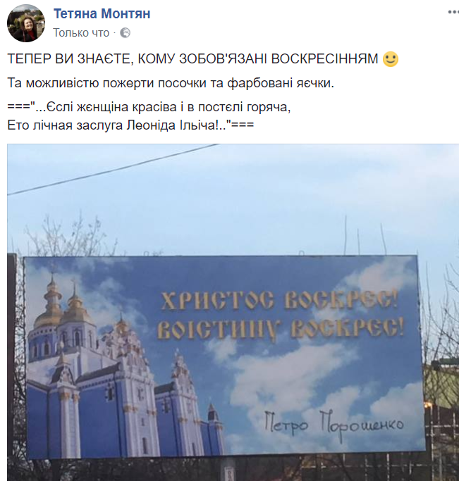 09:27  В Сети продолжают обсуждать пасхальные биг-борды Порошенко. "Теперь мы знаем, кому мы обязаны воскресением", - иронизирует адвокат Татьяна Монтян.