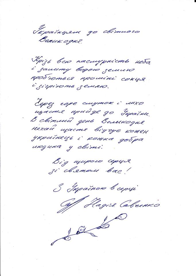 10:44  Надежда Савченко передала рукописное поздравление с Пасхой из СИЗО: