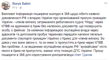 "Информация, распространенная сегодня в СМИ о якобы имеющейся договоренности России с властью Украины об организованном пропуске граждан Украины - членов экипажа задержанного рыболовецкого судна "Норд'' через КПВВ на административной границе с Крымом без надлежащих документов, удостоверяющих личность, является фейком", - написал он.