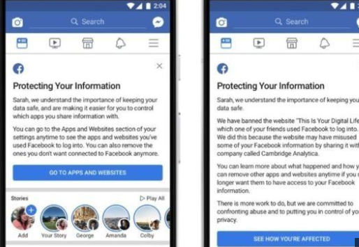 Каждый владелец профиля получит одно из двух сообщений, из которых станет ясно, пострадала ли конфиденциальность их персональных данных. Пользователям покажут, какие приложения и какую информацию с их помощью могли собирать.