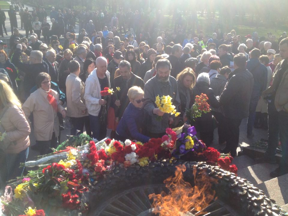Затем к Вечному огню подошла группа из нескольких десятков просоветски настроенных пожилых людей и начали проводить митинг. Администрация мемориала, которая организовывала мероприятие, в ответ включила через динамики гимн Украины и поставила его на повтор. Таким образом заглушая весь митинг.