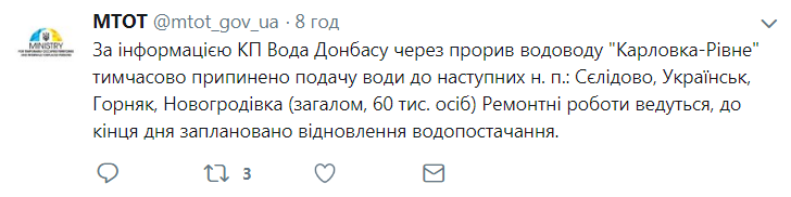 "По информации КП "Вода Донбасса", из-за прорыва водовода "Карловка-Ровно" временно прекращена подача воды в следующие н.п.: Селидово, Украинск, Горняк, Новогродовка (всего 60 тыс. человек)", - сообщает МинВОТ на своей странице в микроблоге Твиттер во вторник.