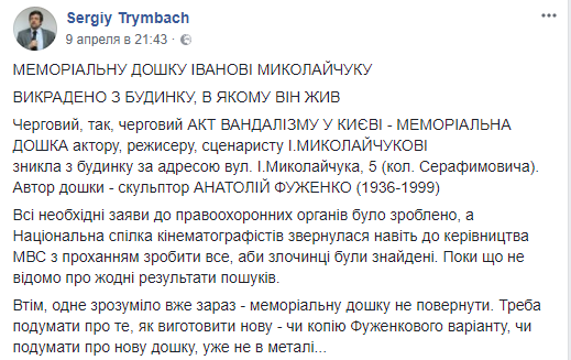 По словам Сергея Трымбача, все необходимые заявления в правоохранительные органы были поданы. Национальный союз кинематографистов обратился к руководству МВД с просьбой сделать все, чтобы преступники были найдены.
