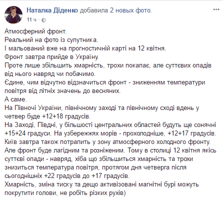 Единственное, чем ощутимо отразится фронт - снижением температуры воздуха от летних значений к весенним. А именно. На севере Украины, северо-западе и северо-востоке днем в четверг будет + 12... + 18 градусов. На Западе, Юге, в большинстве центральных областей будут еще солнечные + 15 ...+ 24 градуса. На побережьях морей - прохладнее, + 12... + 17 градусов. Киев завтра также попадет в зону атмосферного холодного фронта. Но фронт будет мягким и разнеженный. Поэтому в столице 12 апреля какие-то существенные осадки - вряд разве что увеличится облачность и немного снизится температура воздуха в течение дня четверга после сегодняшних +22 градусов до +17 градусов. Облачность, изменение давления и несколько активизированы магнитные бури могут покрутить головы, не делайте резких движений)", - написала она в Facebook.