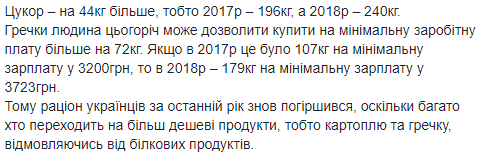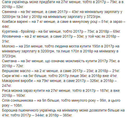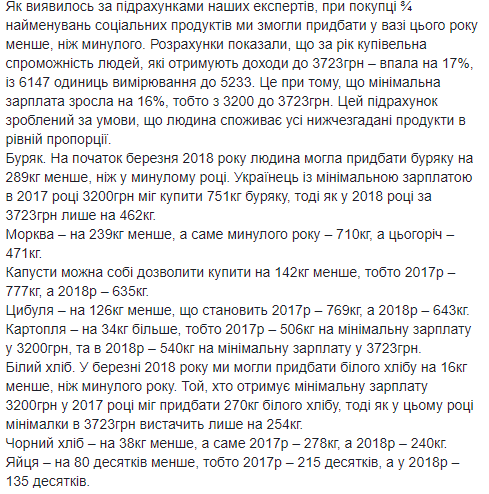 "Как оказалось, по подсчетам наших экспертов, при покупке ¾ наименований социальных продуктов мы смогли приобрести в весе в этом году меньше, чем в прошлом. Расчеты показали, что за год покупательная способность людей, которые получают доходы в 3723грн - упала на 17%, с 6147 единиц измерения до 5233. Это при том, что минимальная зарплата выросла на 16%, то есть с 3200 до 3723грн", - написал в соцсети Дорошенко.