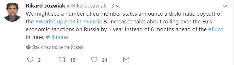 "Вскоре увидим, как ряд стран ЕС объявят дипломатический бойкот Чемпионата мира-2018 в России. Также ведутся развернутые переговоры о продлении экономических санкций ЕС против России на 1 год вместо 6 месяцев накануне саммита Европейского совета в июне", - написал Йозвяк.