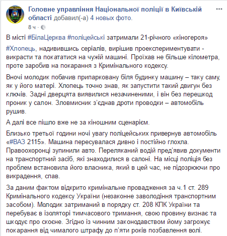 В городе Белая Церковь полицейские задержали 21-летнего  угонщика. Парень, насмотревшись сериалов, решил поэкспериментировать - похитить, показанным там методом автомобиль, и покататься на чужой машине. Проехал не более километра, но заработал статью, как за целое путешествие.