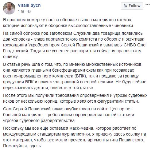 После публикации статьи в журнале "Новое Время" под заголовком "Служили два товарища" о коррупции на госзаказах военно-промышленного комплекса с участием нардепа от "Народного фронта" Сергея Пашинского и заместителя секретаря СНБО Олега Гладковского в редакцию журнала посыпались угрозы. Об этом написал главный редактор издания "Новое Время" Виталий Сыч у себя в Facebook.