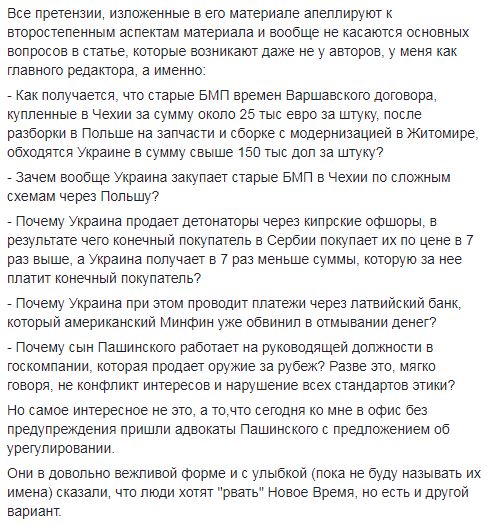 "Они в довольно вежливой форме и с улыбкой (пока не буду называть их имена) сказали, что люди хотят "рвать" Новое Время, но есть и другой вариант, - пишет Сыч. - Я уточнил, что значит "рвать", и не имеется ли ввиду физическая угроза? Они ответили, что, мол, понимайте как хотите, люди там эмоциональные. Потом уточнили, что имеют ввиду людей в Минобороне и окружение Пашинского в парламенте.