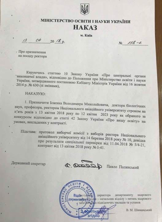 "Назначить Исаенко Владимира Николаевича, доктора биологических наук, профессора, ректором Национального авиационного университета сроком на пять лет с 13 апреля 2018 года по 12 апреля 2023 год в качестве избранного по конкурсу", - говорится в приказе Министерства образования и науки.