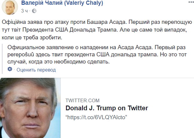"Официальное заявление об атаке против Башара Асада. Первый раз перепощиваю здесь твит Президента США Дональда Трампа. Но это именно тот случай, когда так нужно сделать".