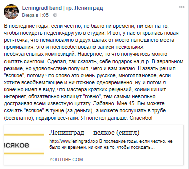 "Назвать решил "всякое", потому что слово это очень русское, многоплановое, если хотите всеобъемлющее и ничтожное одновременно, ну и потом я конечно имел в виду, что мастера кратких рецензий, коими кишит интернет, обязательно напишут "говно", тем самым невольно достраивая всем известную цитату. Забавно. Мне 45. Вы можете скачать "всякое" в тунце (за деньги), а можете послушать в трубе (бесплатно), подарок все-таки. Я полетел дальше. Спасибо!", - написал Шнуров.