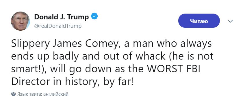 "Слизняк Джеймс Коми, который всегда плохо кончает и, несомненно, войдет в историю, как худший директор ФБР", - пишет Трамп.