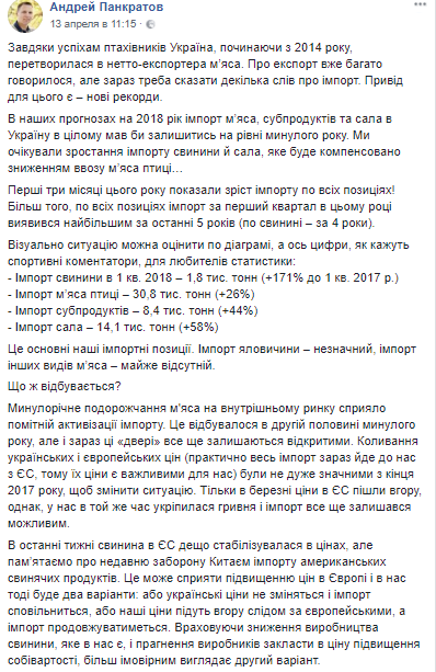 "Прошлогоднее подорожание мяса на внутреннем рынке способствовало заметной активизации импорта. Это происходило во второй половине прошлого года, но и сейчас эти "двери" все еще остаются открытыми. Колебания украинских и европейских цен (практически весь импорт сейчас идет к нам из ЕС, поэтому их цены важны для нас) были не очень значительными с конца 2017 года, чтобы изменить ситуацию. Только в марте цены в ЕС пошли вверх, однако, у нас в то же время укрепилась гривна и импорт все еще оставался возможным", - написал эксперт.