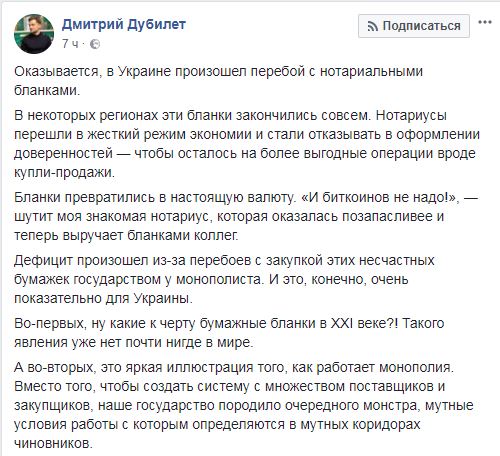 "Дефицит произошел из-за перебоев с закупкой этих несчастных бумажек государством у монополиста. И это, конечно, очень показательно для Украины", - пишет Дубилет.