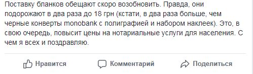 По данным Дубилета, поставку бланков обещают скоро возобновить. Правда, они подорожают в два раза до 18 грн (кстати, в два раза больше, чем черные конверты monobank с полиграфией и набором наклеек). Это, в свою очередь, повысит цены на нотариальные услуги для населения.